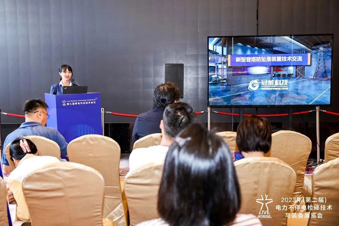 廣東冠能電力科技發展有限公司技術人員李雨欣在“展區新產品技術沙龍”做“新型登塔防墜落裝置”技術交流。
